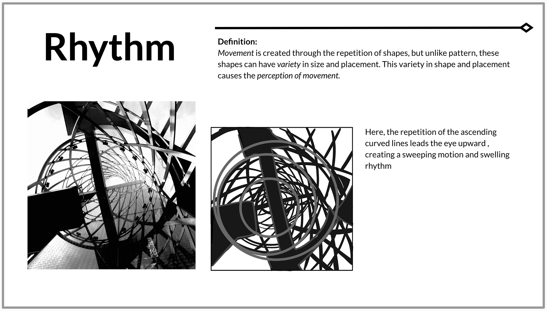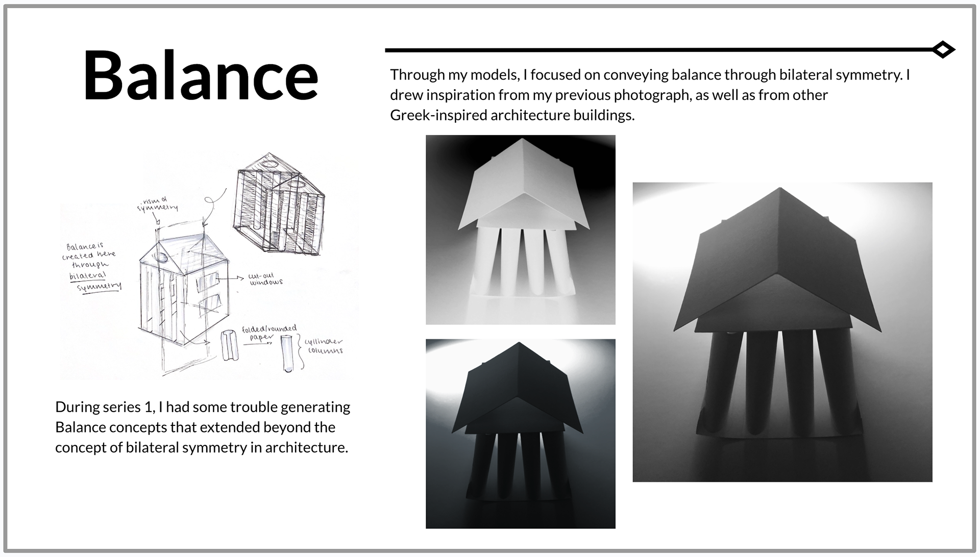 The nine principles of design we would be representing through our models were: Gestalt, Pattern, Economy, Balance, Proportion, Rhythm, Gradient, Emphasis, and Contrast. We drew initial inspiration from photographed objects in everyday life.